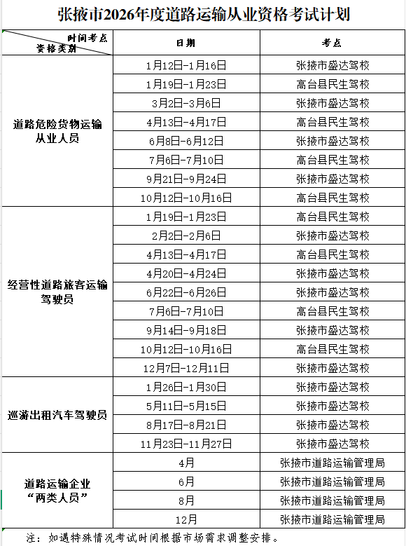 為方便道路運(yùn)輸從業(yè)人員合理規(guī)劃時(shí)間,更好滿足道路運(yùn)輸從業(yè)人員考試需求,結(jié)合市場及行業(yè)發(fā)展需求,現(xiàn)將張掖市2026年度道路運(yùn)輸從業(yè)資格考試計(jì)劃公告如下。請各有關(guān)單位和個(gè)人科學(xué)合理安排時(shí)間,結(jié)合自身實(shí)際選擇考試期次,提前與考點(diǎn)溝通有關(guān)情況;參加巡游出租汽車駕駛員考試人員根據(jù)選定時(shí)間通過張掖市交通運(yùn)輸局官網(wǎng)或公眾號發(fā)布的公告提前3天預(yù)約報(bào)名;各考點(diǎn)應(yīng)提前5天與市道路運(yùn)輸管理局溝通相關(guān)事宜。
