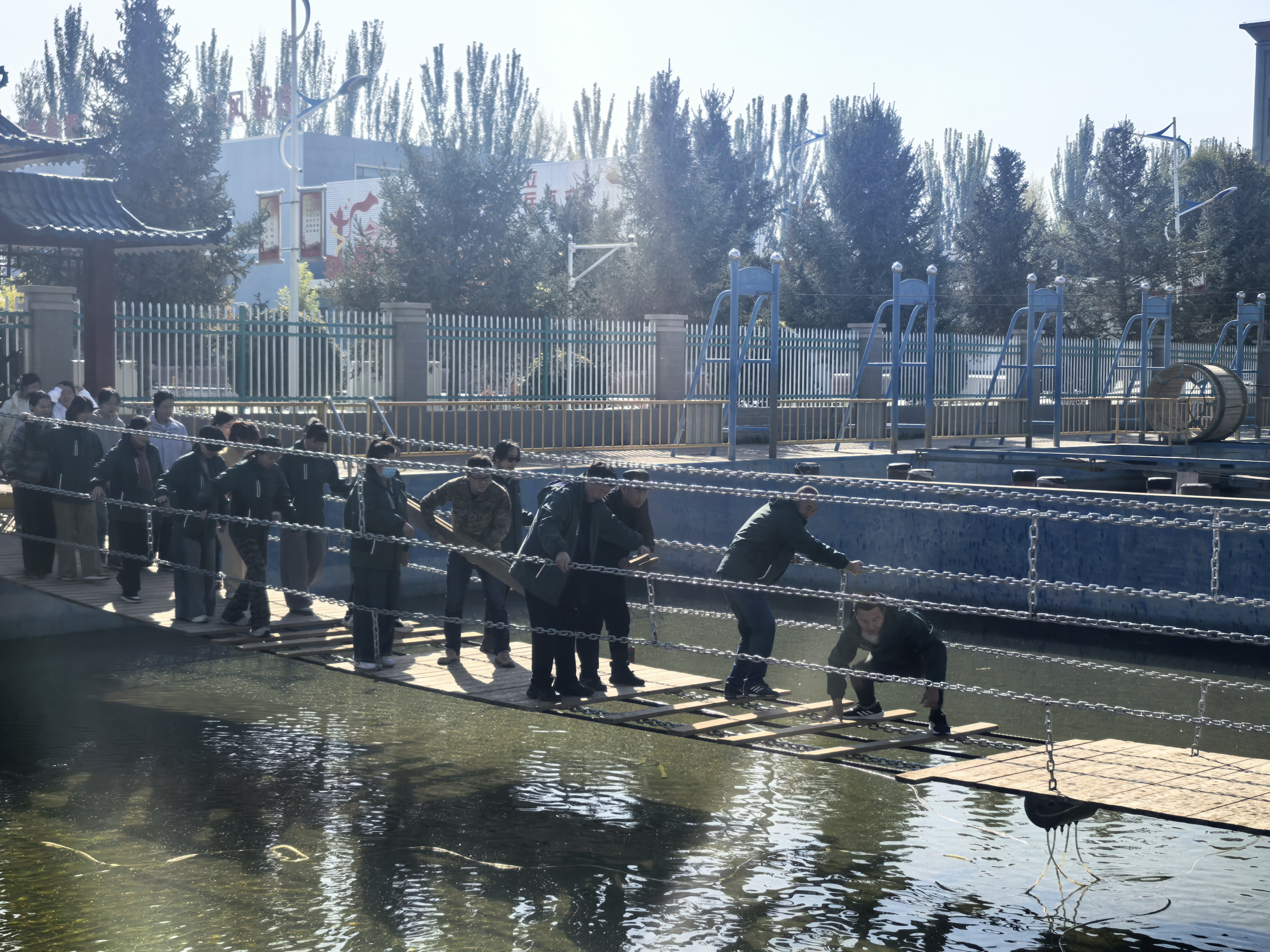 當(dāng)天上午,全體教職工來到綜合實(shí)踐基地,先后參觀了生命與科技實(shí)踐區(qū)、手工技能區(qū)及張掖市國防園等主題功能區(qū),詳細(xì)了解現(xiàn)代科技賦能教育事業(yè)發(fā)展的創(chuàng)新成果,深入感受我國國防建設(shè)的發(fā)展歷程與重要成就。素質(zhì)拓展中,老師們熱情投入“飛奪瀘定橋”“水上蕩橋”等項(xiàng)目。面對搖晃的索橋,大家群策群力,互相鼓勵(lì),讓團(tuán)隊(duì)協(xié)作的力量愈發(fā)凸顯。尤其在“飛奪瀘定橋”項(xiàng)目中,老師們互相配合踩著晃動(dòng)木板前進(jìn),在攜手共渡難關(guān)中深化了信任與凝聚力。