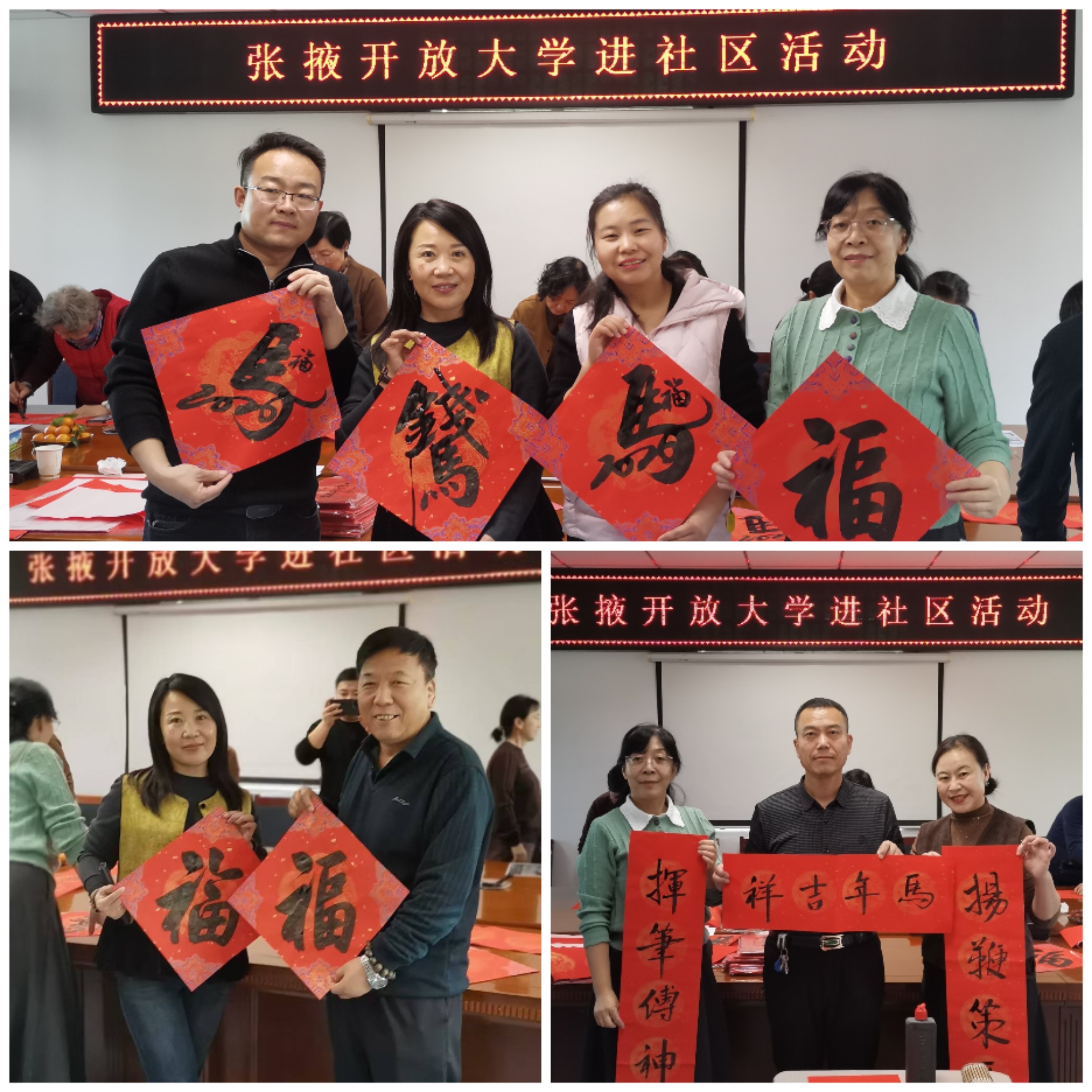 春聯(lián)傳情暖萬家,筆墨生香迎福年。1月8日,張掖開放大學(xué)開展“老年友好型社區(qū)教育服務(wù)”系列活動,組織社區(qū)教育老年書畫班學(xué)員走進甘州區(qū)西街街道新樂社區(qū),為社區(qū)居民義務(wù)揮毫寫春聯(lián),為社區(qū)居民送上新年祝福。