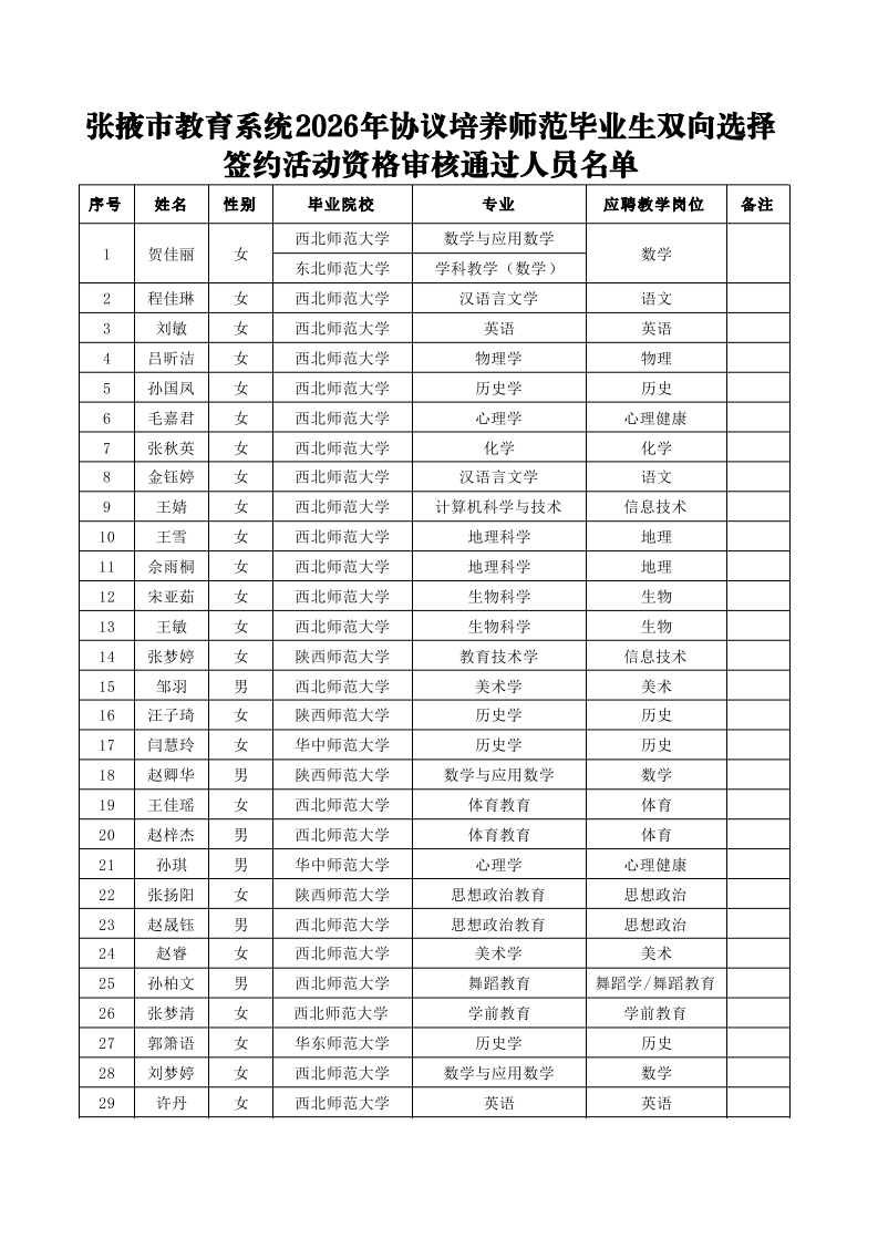 附件:張掖市教育系統(tǒng)2026年協(xié)議培養(yǎng)師范畢業(yè)生雙向選擇簽約活動(dòng)資格審核通過(guò)人員名單