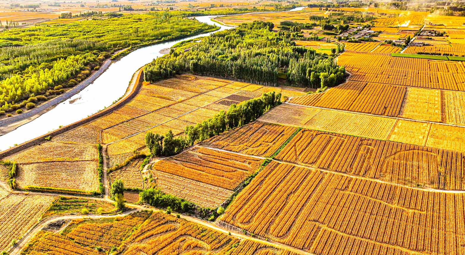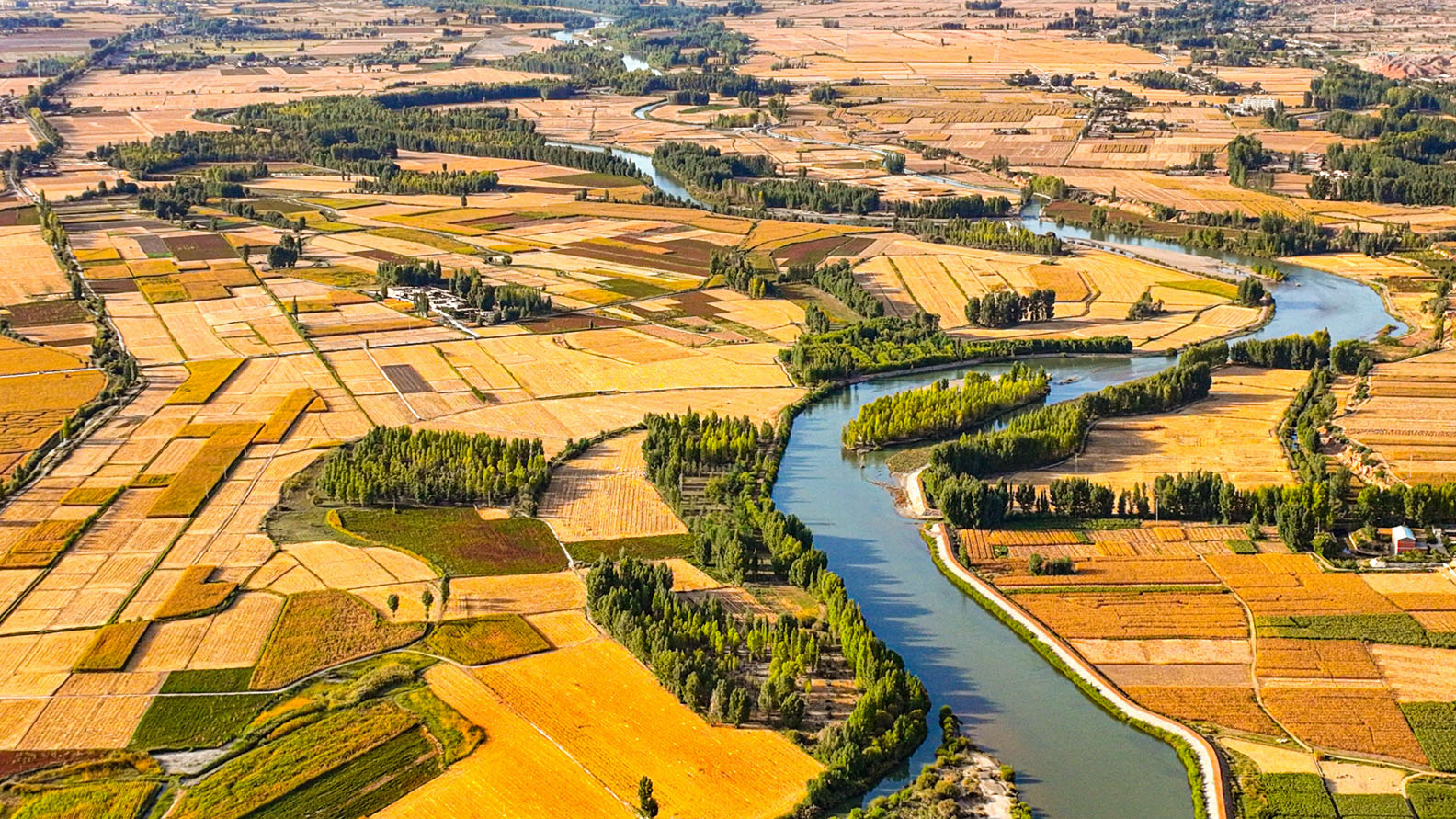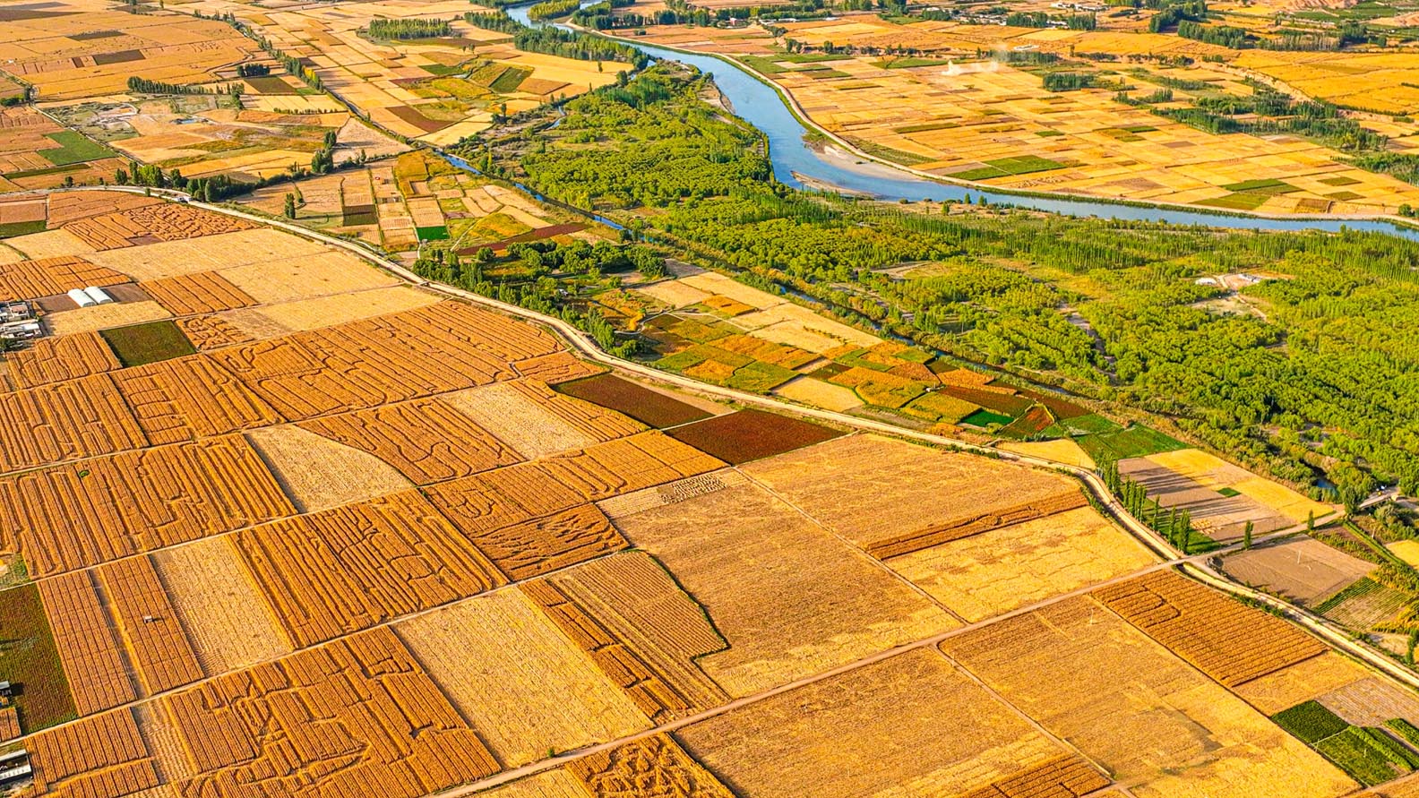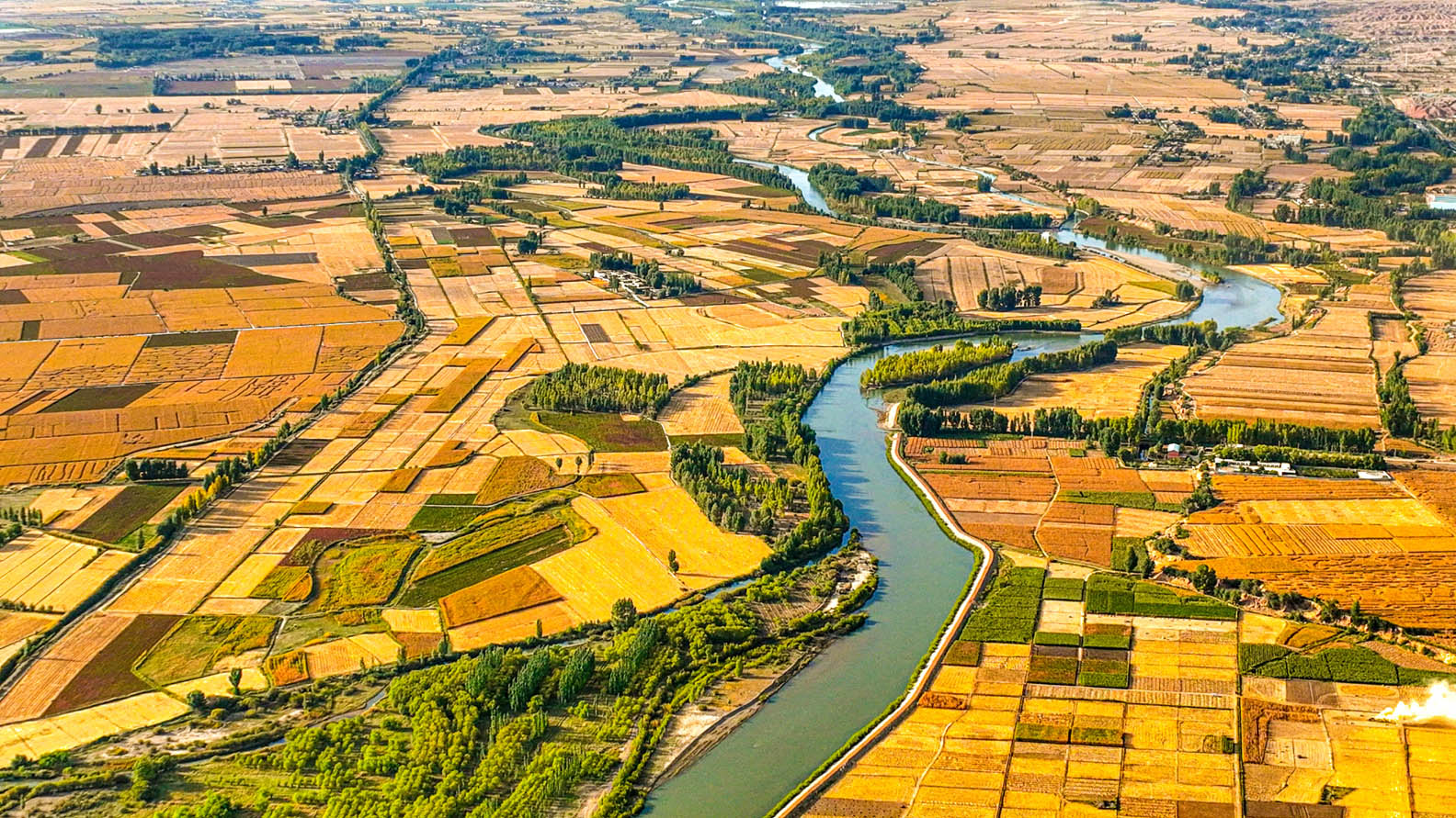 金秋時節(jié),清澈明亮緩緩流淌的黑河水,宛如一條碧帶,黑河兩岸的田野里,張掖市臨澤縣正在收獲的玉米、水稻、辣椒等農(nóng)作物和周邊的樹木、蘆葦、濕地在和煦陽光的照耀下色彩斑斕,構成了一幅絢麗多彩的秋收畫卷。