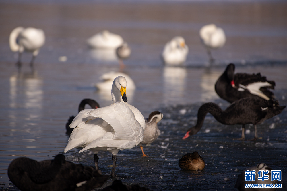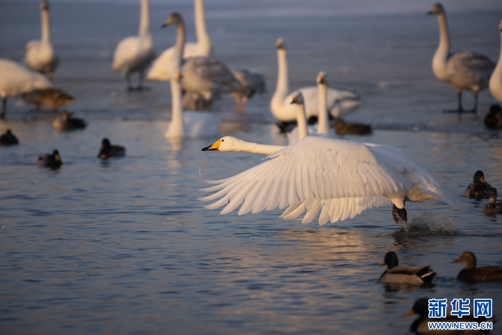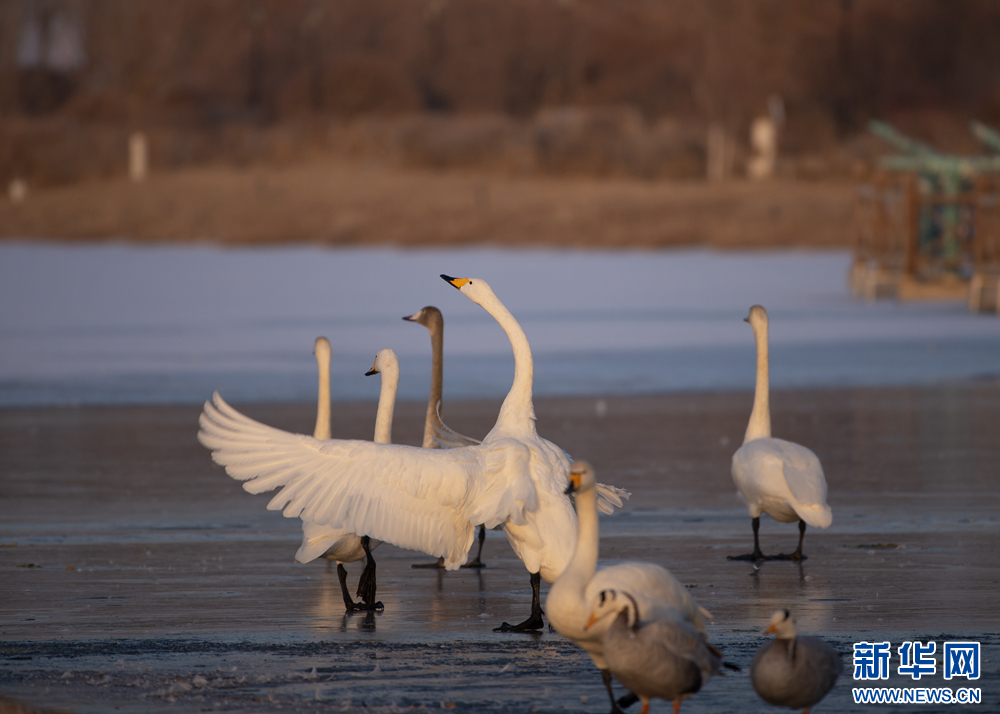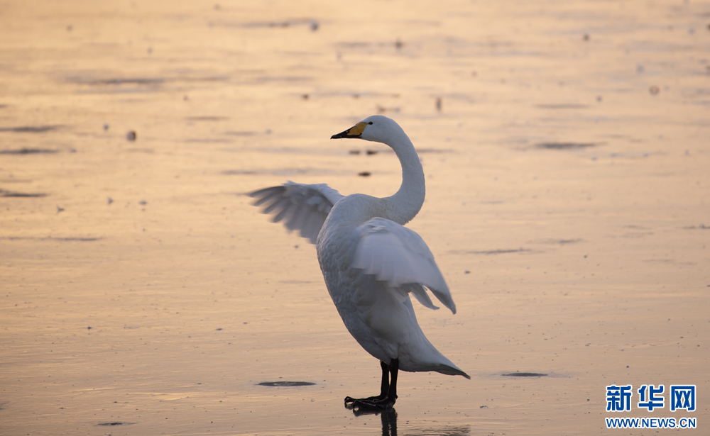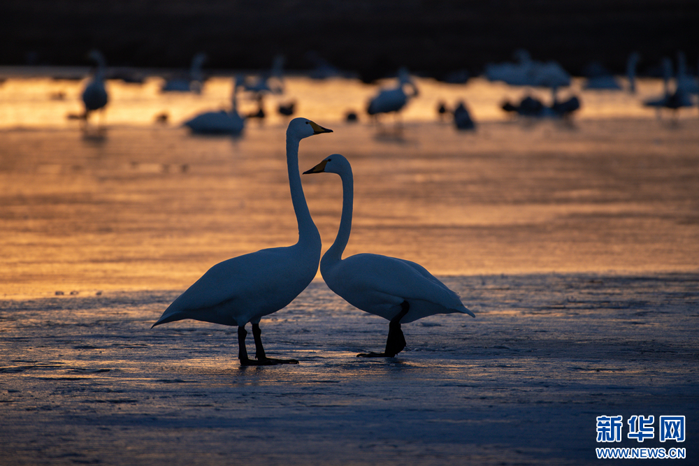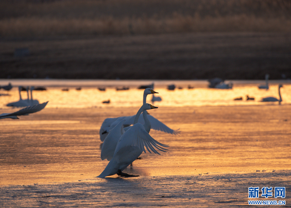 冬日的白天鵝在甘肅張掖國家濕地公園的夕陽下翩翩起舞,此起彼伏的鳴唱,柔美的身姿,在陽光里揉成一幅金色畫卷。新華網(wǎng)發(fā)(劉旭明 攝)