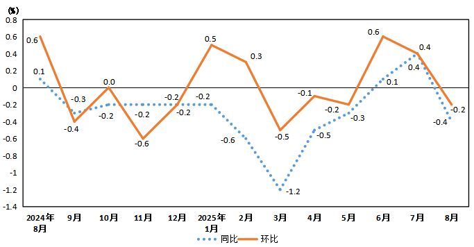 2025年8月份,張掖居民消費(fèi)價(jià)格同比下降0.4%。其中,食品價(jià)格下降4.4%,非食品價(jià)格上漲0.5%;消費(fèi)品價(jià)格下降0.8%,服務(wù)價(jià)格上漲0.2%。