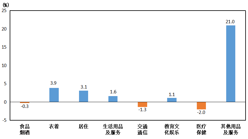 其他七大類價(jià)格同比“五漲二降”。其中,其他用品及服務(wù)類價(jià)格上漲21.0%,衣著類價(jià)格上漲3.9%,居住類價(jià)格上漲3.1%,生活用品及服務(wù)類價(jià)格上漲1.6%,教育文化娛樂類價(jià)格上漲1.1%;醫(yī)療保健類價(jià)格下降2.0%,交通通信類價(jià)格下降1.3%。