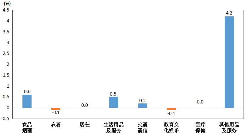 其他七大類價(jià)格環(huán)比“三漲二降二平”。其中,其他用品及服務(wù)類價(jià)格上漲4.2%,生活用品及服務(wù)類價(jià)格上漲0.5%,交通通信類價(jià)格上漲0.2%;衣著、教育文化娛樂類價(jià)格均下降0.1%;居住、醫(yī)療保健類價(jià)格持平。