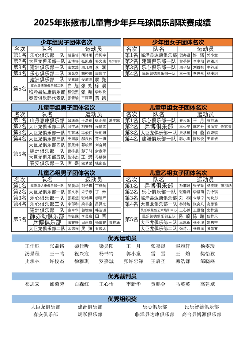 11月30日,“奔跑吧·少年”兒童青少年主題健身活動暨2025年張掖市少年兒童乒乓球俱樂部聯(lián)賽在甘州區(qū)體育館圓滿落下帷幕。本次聯(lián)賽由張掖市體育局主辦,甘州區(qū)文體廣電和旅游局、張掖市乒乓球運動協(xié)會承辦,張掖大巨龍體育文化傳播有限公司協(xié)辦。