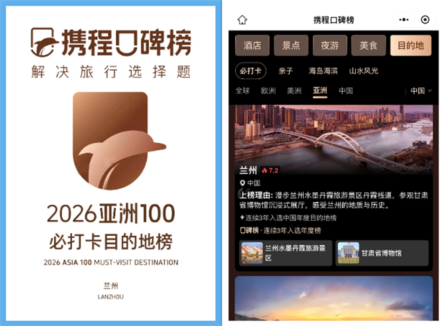 同期,基于攜程億級真實(shí)用戶口碑?dāng)?shù)據(jù)、涵蓋26年行業(yè)深耕經(jīng)驗(yàn)的2026攜程口碑榜年度榜單重磅發(fā)布。該榜單如同一位擁有繞地球15億圈旅行足跡的智慧向?qū)?,洞察每一次抵達(dá)與離開的動機(jī)。在本次覆蓋全球108個(gè)國家、包含93個(gè)主題榜單的權(quán)威評選中,甘肅三大核心目的地以其不可替代的獨(dú)特魅力強(qiáng)勢登榜: