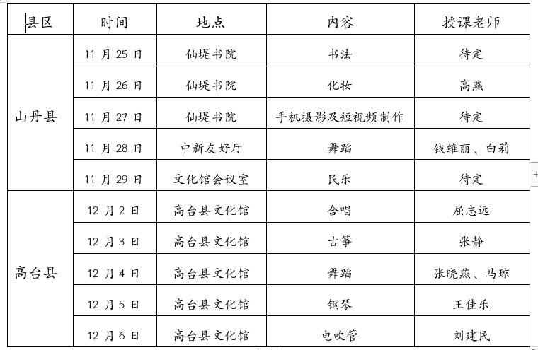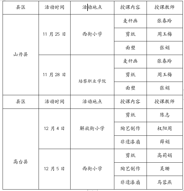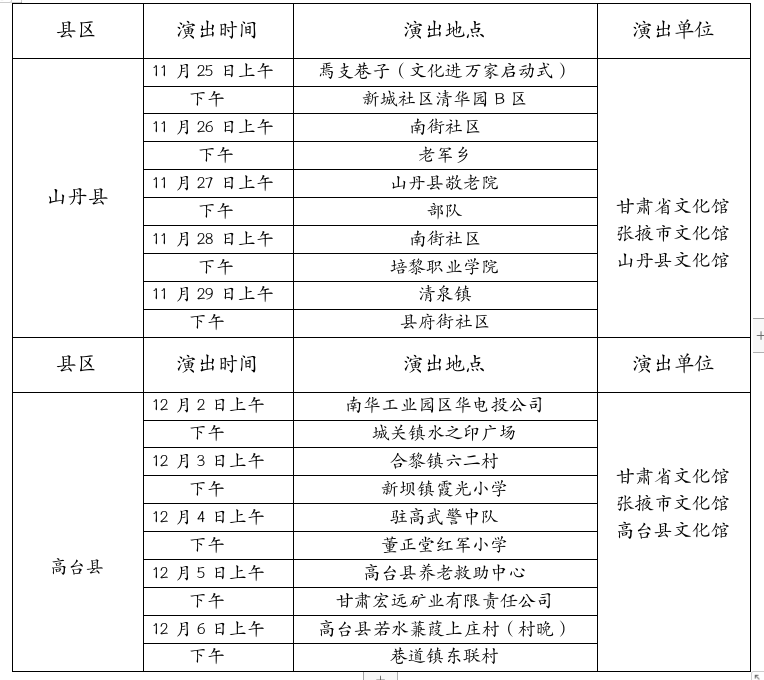 邀請省市區(qū)三級文化館文藝工作者、文藝骨干、各級非遺傳承人,分別在山丹縣、高臺縣的各鄉(xiāng)鎮(zhèn)、學(xué)校、社區(qū)、部隊、景區(qū)等地,開展67場次的文化活動,具體安排見附件1。