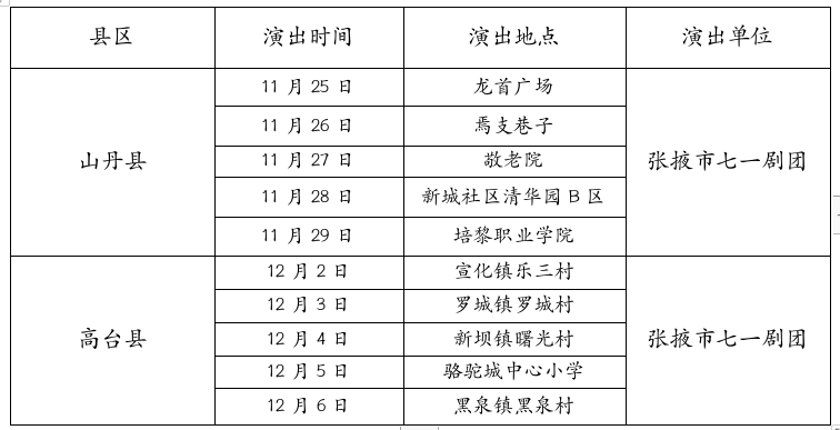 為持續(xù)加大文化惠民演出力度,讓更多精品演出走進(jìn)鄉(xiāng)村和社區(qū),進(jìn)一步豐富廣大人民群眾的精神文化生活。將在山丹縣 、高臺縣部分社區(qū)、鄉(xiāng)村開展戲曲進(jìn)鄉(xiāng)村、進(jìn)社區(qū)惠民演出,共計10場次。