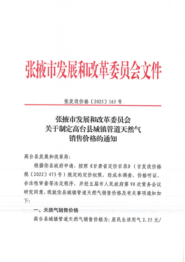 關(guān)于制定高臺(tái)縣城鎮(zhèn)管道天然氣銷售價(jià)格的通知