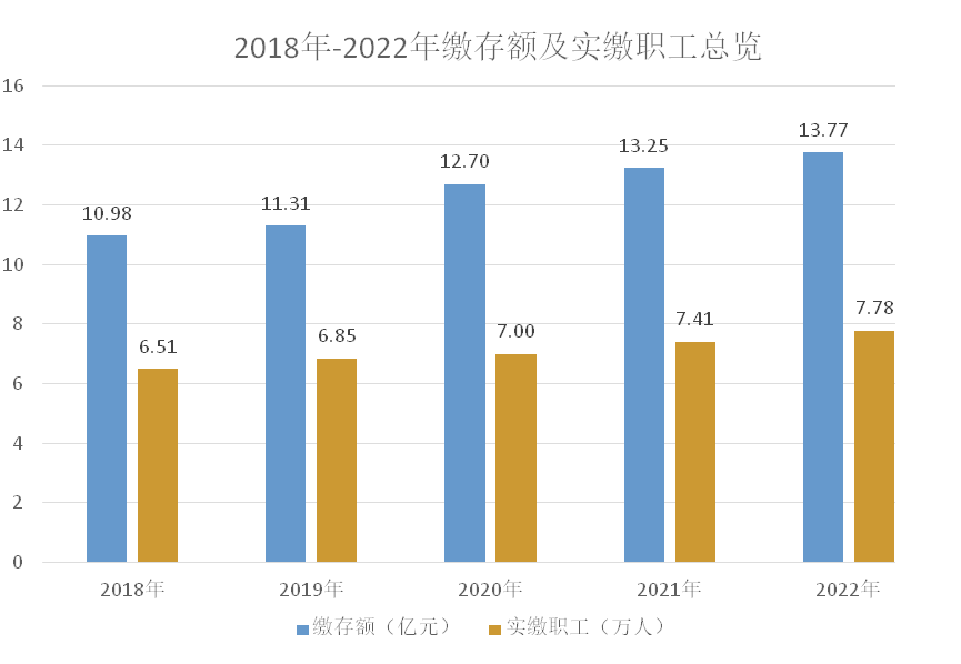 (一)制度覆蓋面擴(kuò)大,繳存額穩(wěn)步增長。2022年,中心克服疫情影響,堅(jiān)持強(qiáng)化政策宣傳,以非公企業(yè)為重點(diǎn)開展“政策進(jìn)萬家”活動(dòng),通過實(shí)施源頭引領(lǐng)建制、宣傳助推建制、信用促進(jìn)建制、執(zhí)法保障建制等工作機(jī)制,督促不繳欠繳單位履行繳存義務(wù),有力維護(hù)職工合法權(quán)益,歸集額持續(xù)增長。《年報(bào)》披露:2022年,全市實(shí)繳單位2140家,實(shí)繳職工7.78萬人,當(dāng)年繳存額由2018年的10.98億元增長至2022年的13.77億元,五年累計(jì)增幅25.41%。2022年末繳存總額123.96億元,比上年末增加12.49%;繳存余額58.33億元,同比增長7.48%。繳存額逐年遞增,實(shí)現(xiàn)近五年來最好成績。