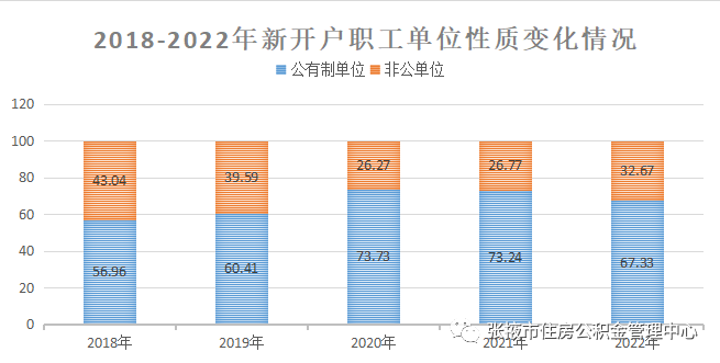 2.非公單位繳存占比提高,保障職工合法權(quán)益。近年來,中心加強請示匯報,提請市政府辦公室下發(fā)了《關(guān)于進一步擴大住房公積金制度覆蓋范圍的實施意見》,多渠道宣傳“減負便民惠企”政策,努力擴大制度覆蓋面,提升制度普惠性。報告顯示,2022年,從實繳職工所在單位性質(zhì)看,公有制單位(含國家機關(guān)和事業(yè)單位、國有企業(yè)、城鎮(zhèn)集體企業(yè))實繳職工數(shù)占實繳職工總數(shù)的89.22%,非公單位(含外商投資企業(yè)、城鎮(zhèn)私營企業(yè)及其他城鎮(zhèn)企業(yè)、民辦非企業(yè)單位和社會團體等)實繳職工數(shù)占10.78%。近三年來,非公單位新開戶職工占當年新開戶職工的比例由26.27%提高至32.67%,說明隨著住房公積金政策紅利不斷釋放,職工維護權(quán)利意識不斷提高,住房公積金制度吸引力不斷增強。