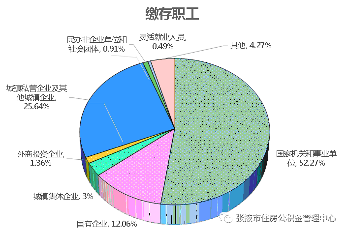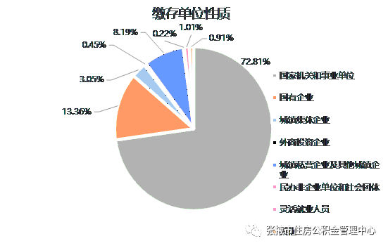 繳存職工中,國家機關(guān)和事業(yè)單位占72.81%,國有企業(yè)占 13.36%,城鎮(zhèn)集體企業(yè)占3.05%,外商投資企業(yè)占0.45%,城鎮(zhèn)私營企業(yè)及其他城鎮(zhèn)企業(yè)占8.19%,民辦非企業(yè)單位和社會團體占0.22%,靈活就業(yè)人員占1.01%,其他占0.91%。